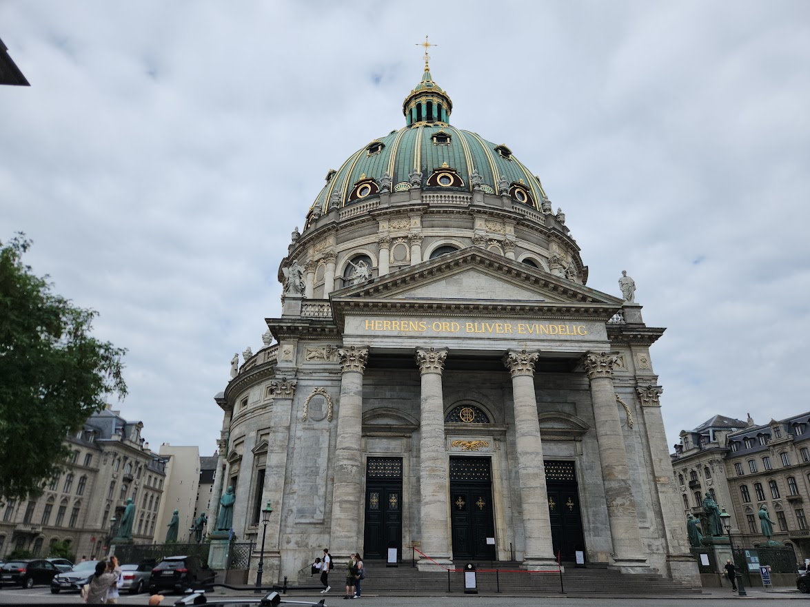 Unfortunately for everyone, someone with influence rented out the inside of the church for their wedding. So, we had to remain content with how it looked from the outside. The inscription at the top of the marble church reads in Danish, "The Lord's word stays eternal".
